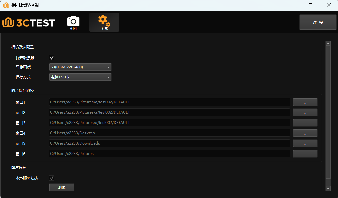 支持相機前景器設(shè)置、手動調(diào)節(jié)拍攝畫質(zhì)、自定義選擇相片保存模式及路徑和服務(wù)器連接狀態(tài)測試。