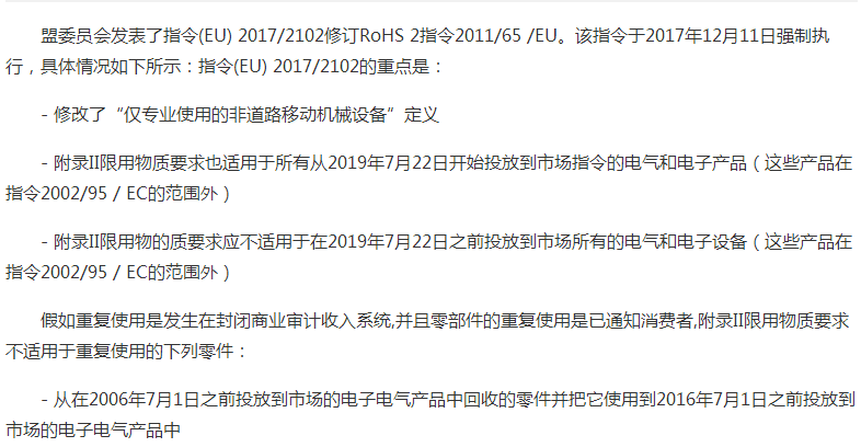 盟委員會發表了指令(EU) 2017/2102修訂RoHS 2指令2011/65 /EU。該指令于2017年12月11日強制執行,具體情況如下所示:指令(EU) 2017/2102的重點是: