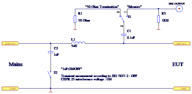 TAN8124人工網(wǎng)絡(luò)代替車輛線束的阻抗,用做參考標(biāo)準(zhǔn),以測定設(shè)備及電氣和電子裝置的性能。適合于測量汽車電子、飛機和艦船的干擾電壓,頻率范圍0.1-110MHz。符合CISPR 25和ISO 7637-2要求。依據(jù)ISO 7637-2標(biāo)準(zhǔn),可以測量瞬態(tài)干擾。內(nèi)置可切換的50歐姆負載。